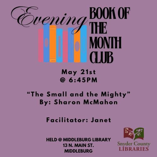 Thursday Evening BookclubPost author:Justin EmerlePost published:April 23, 2025Post category:UncategorizedPost comments:0 CommentsThe Evening Book Club meets the third Thursday of each month at 6:45 pm in the upstairs conference room in the Middleburg Borough Building. Anyone is welcome to attend all or just one meeting! You Might Also Like Cookbook Club December 15, 2025 Tuesday Morning Book Club April 23, 2025 New Mobile Hotspots September 30, 2025Leave a Reply Cancel replyCommentEnter your name or username to commentEnter your email address to commentEnter your website URL (optional) Save my name, email, and website in this browser for the next time I comment. Δ